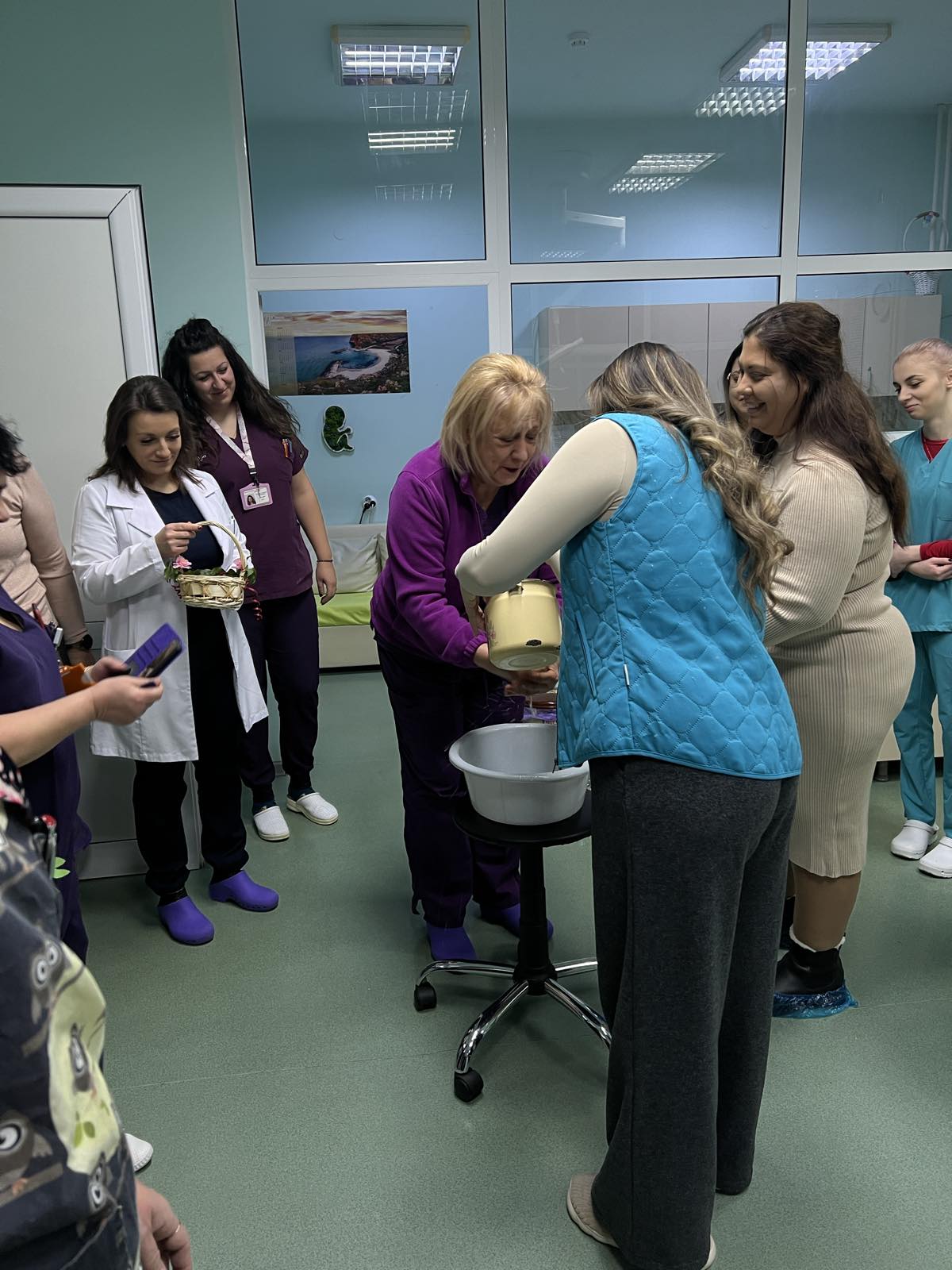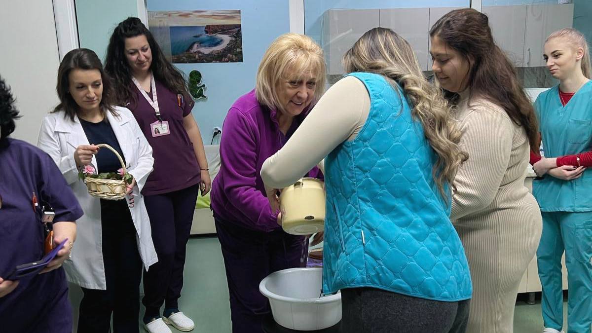 Рано тази сутрин – на Бабинден, целият екип участва в традиционния ритуал „миене на ръце“ по повод Деня на родилната помощ – 21 януари. Бяха измити ръцете на д-р Диана Гугова и след това на останалите лекари. Персоналът и родилките от всички стаи в отделението, бяха поръсени за здраве със светена вода.