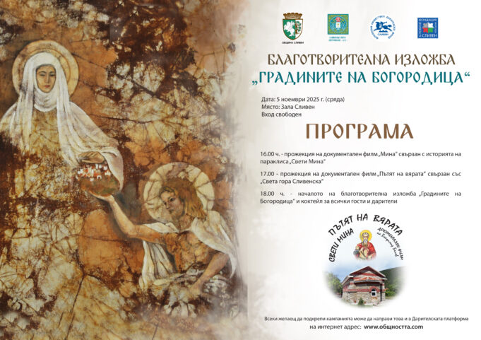 Събитието е част от дългогодишната кампания на Фонда „По пътя на Вярата”. Началото на благотворителна изложба, с автор Дора Куршумова, е в 18 ч. Два часа по – рано, от 16 ч. и от 17 ч., ще се прожектират документалните филми – „Мина”, свързан с историята на параклиса „Свети Мина” и „Пътят на вярата”, който разказва за Света гора Сливенска. Режисьор и на двете продукции е Владимир Белов.
