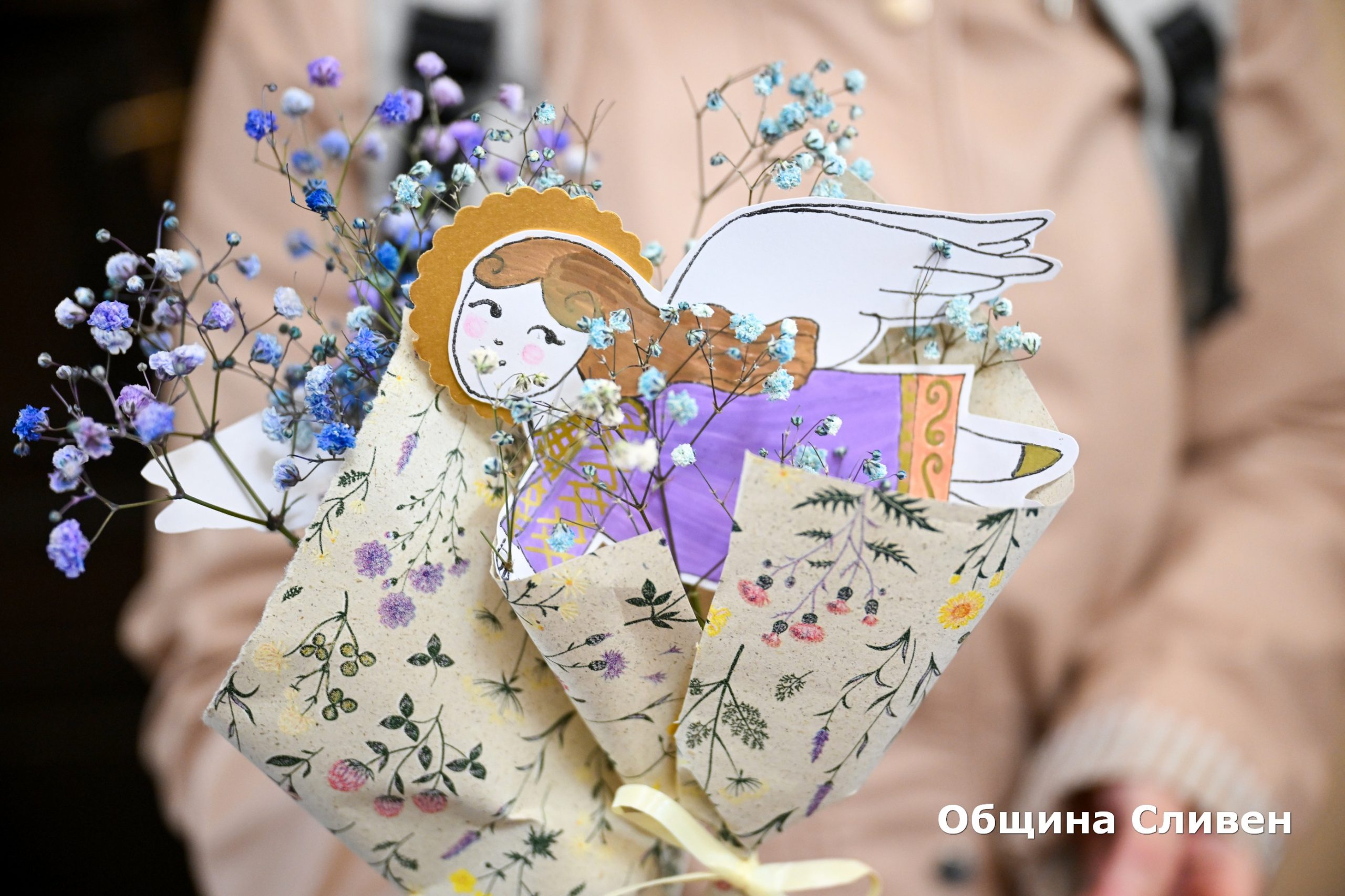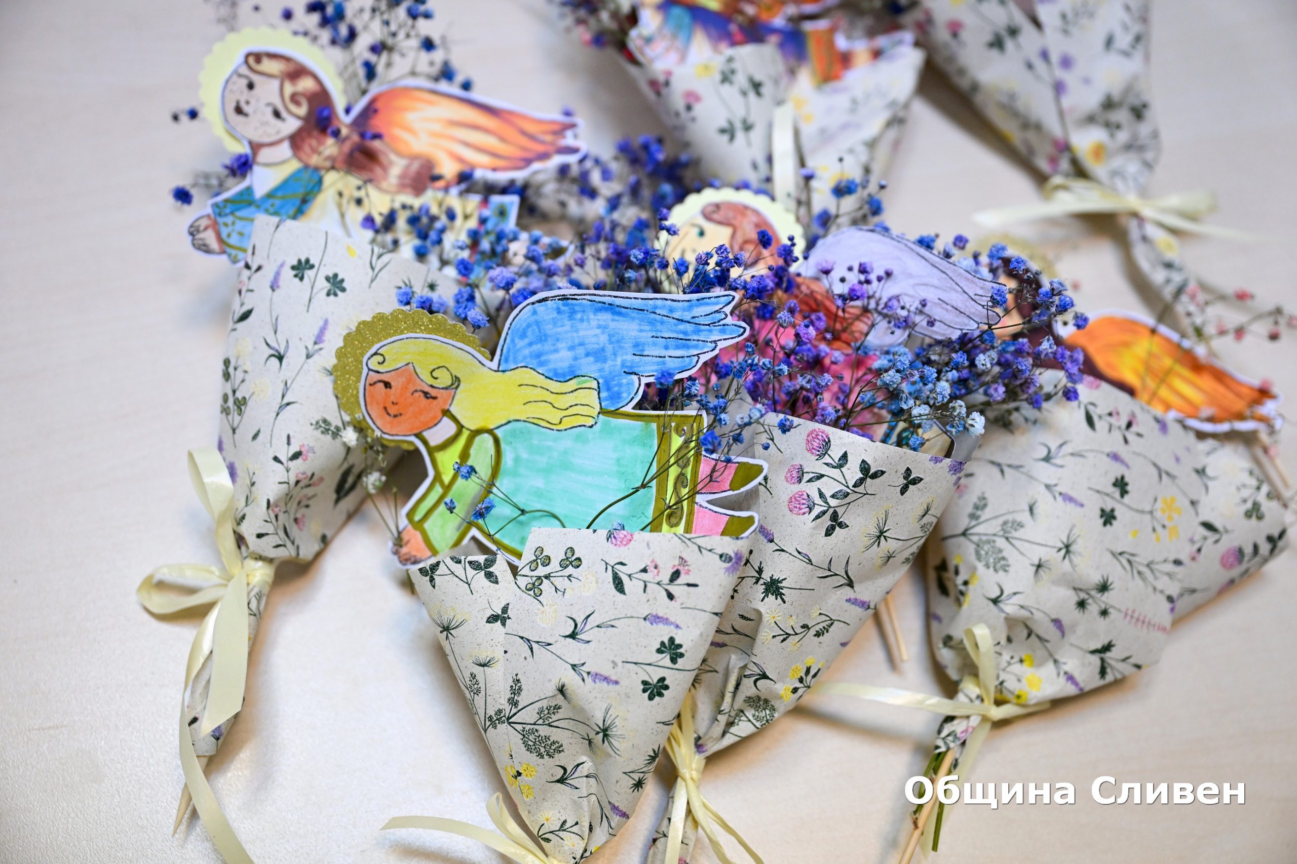Инициативата по повод светлия християнски празник се проведе с благословението на Сливенския митрополит Арсений. На всяка от дамите в общинската администрация беше поднесен букет с интересна аранжировка – ангел, държащ в ръцете си бяло цвете.