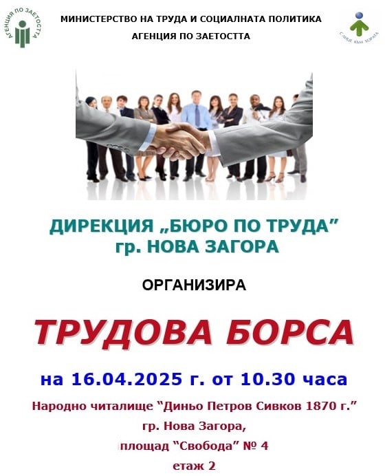 Дирекция „Бюро по труда“ организира трудова борса в Нова Загора. Тя ще се състои на 16 април /сряда/ от 10:30 часа в НЧ „Д. П. Сивков – 1870“ , ет.2.