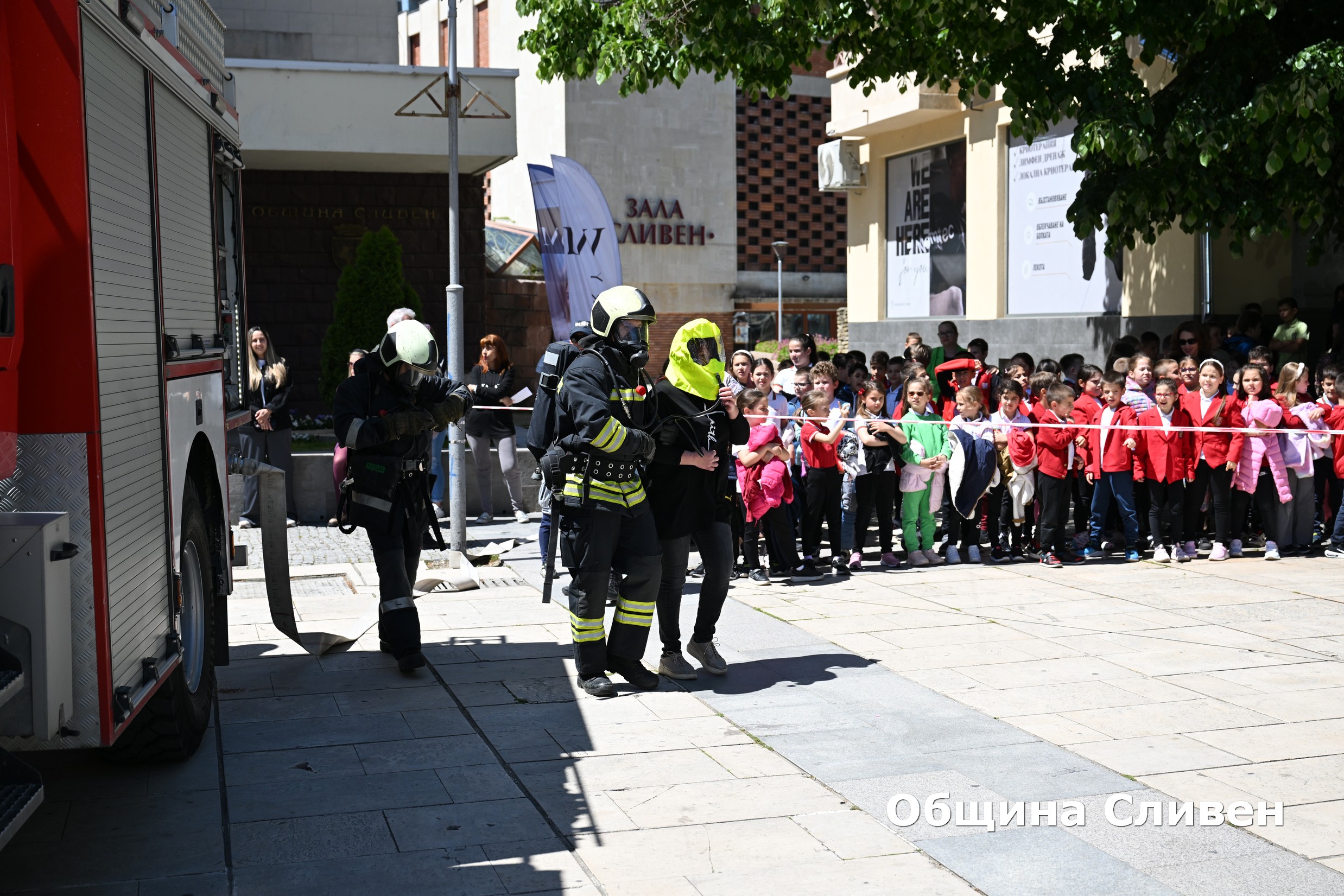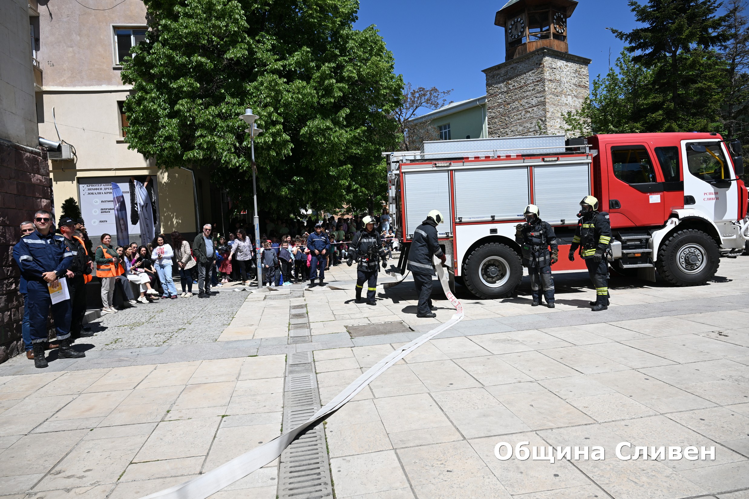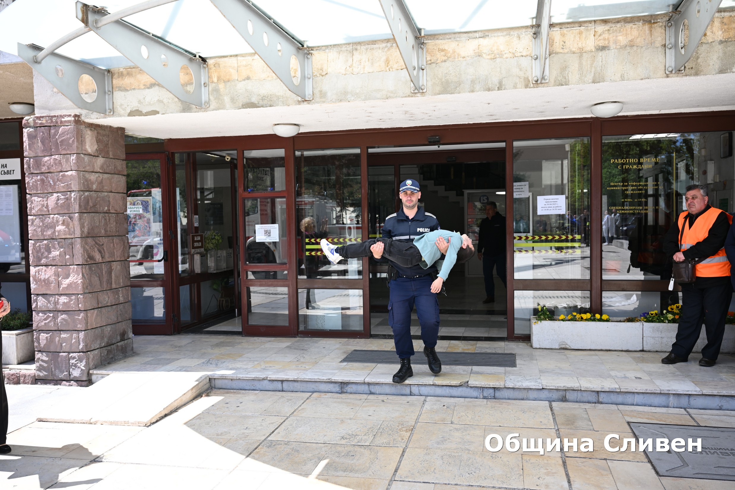 Евакуацията се проведе с прякото участие на екипи от основния състав на единната спасителна система – полиция, пожарна, спешна помощ и Български червен кръст, екип от „Общинска охрана и СОТ Сливен“. В симулацията участваха десет полицаи, три пожарни автомобила, линейка за спешна помощ и екип с автомобил на БЧК и служители на общинската охрана.