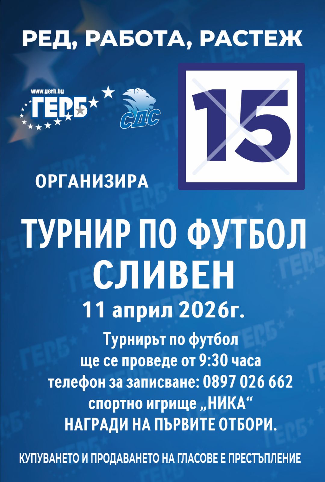„Футболният турнир, който по традиция организираме, има за цел да стимулира развитието на любителския спорт и приобщаването на младите хора към активен начин на живот, защото спортът не е само здраве. Той изгражда екипност, дисциплина и лидерски умения. А Сливен е с традиции в спорта и се надявам да подобрим рекорда от последното издание, когато се включиха 14 отбора, а зрителите бяха близо 300“, коментира един от организаторите Стефан Гурков, който е под номер 8 в листата на ГЕРБ – СДС в Сливен.