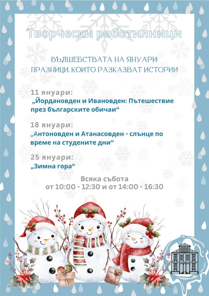 По този повод всяка събота през януари в РИМ-Сливен ще се проведат поредица от творчески работилници посветени на зимните празници и обичаи, сред които Йордановден, Ивановден, Антоновден и Атанасовден. Заниманията ще се провеждат в сградата на Регионален исторически музей – Сливен от 10 ч. до 12,30 ч. и от 14 ч. до 16,30 ч. За да се включите е необходимо предварително записване на телефон: 0879 514 171, Десислава Панайотова, музеен педагог.