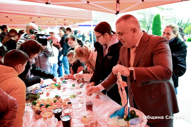 На Велики четвъртък площадът пред сградата на Община Сливен се изпъстри с цветове, настроение и детски усмивки. Много деца и възрастни се включиха в традиционното боядисване на яйца. Кметът Стефан Радев се присъедини към събитието.