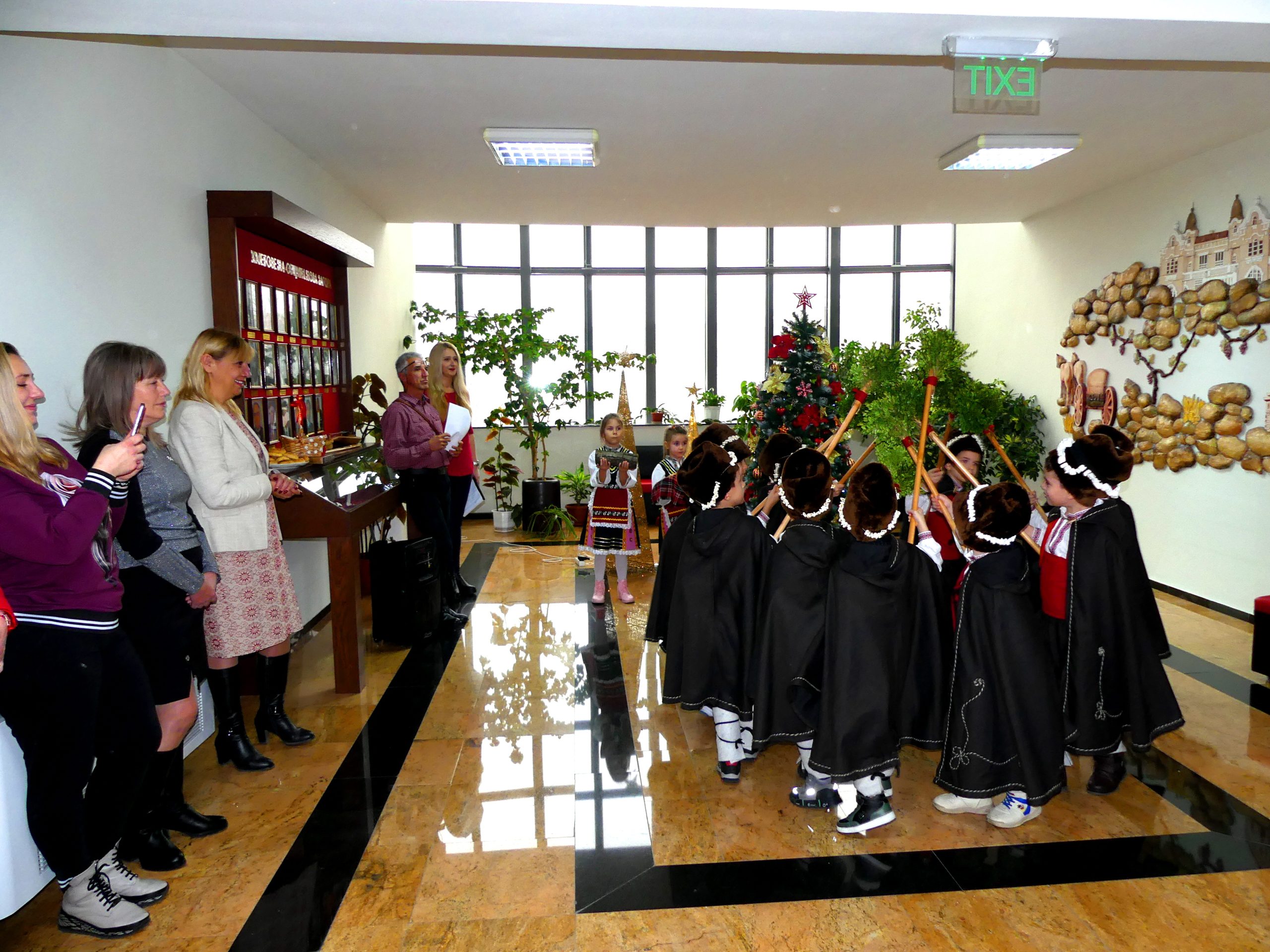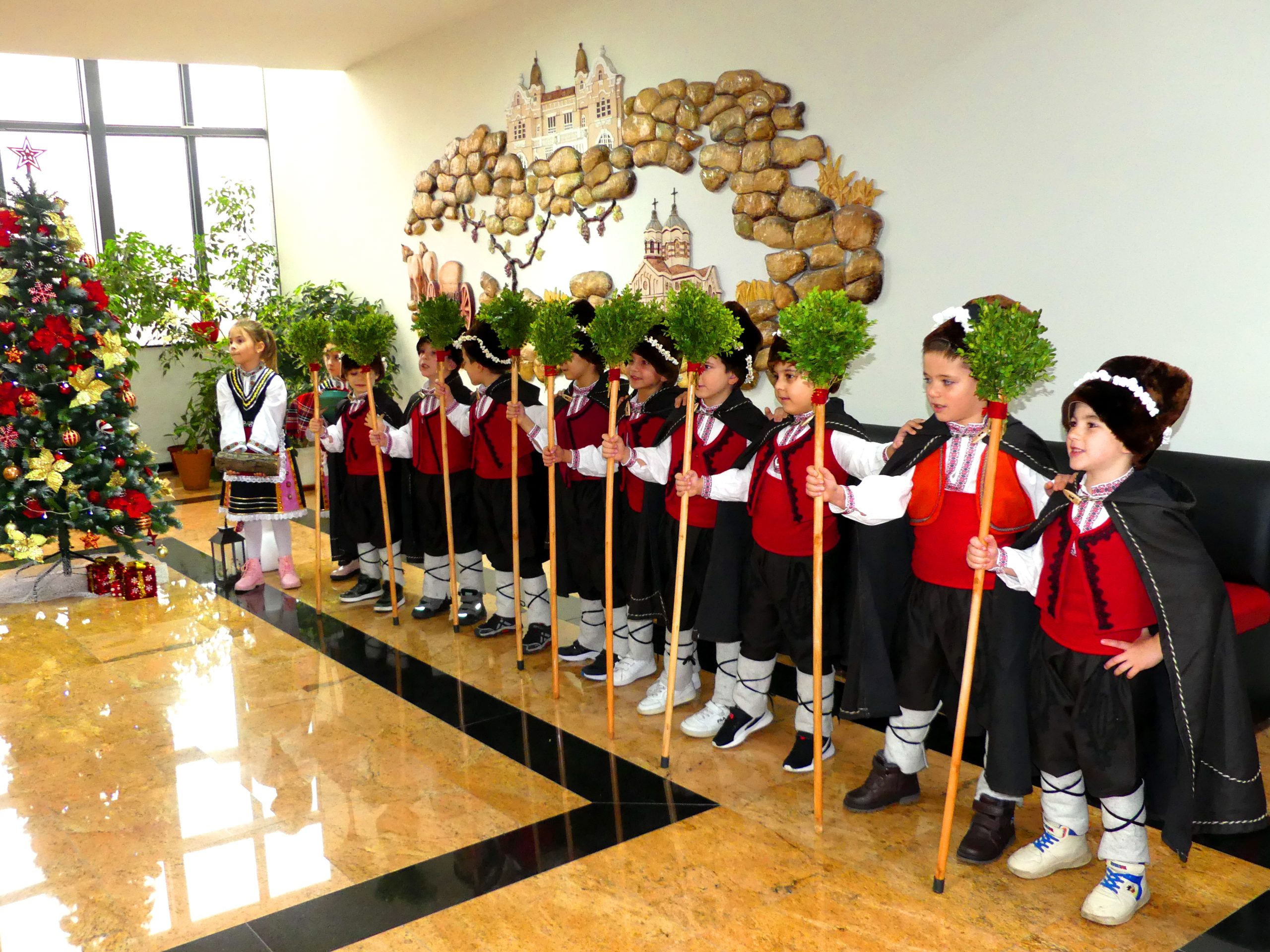 Първи в сградата на Общинска администрация стъпиха малчуганите от ДГ „Слънчице“, които отправиха своите пожелания за Рождество Христово и Нова година с красива коледна песен. Към тях, с тежки ямурлуци, дървени геги и гиздавите калпаци, се присъединиха коледарите от ДГ „Надежда“. Възпитаниците на детското заведение бяха подготвили истински празничен спектакъл с песни и наричания за здрава и богата година.
