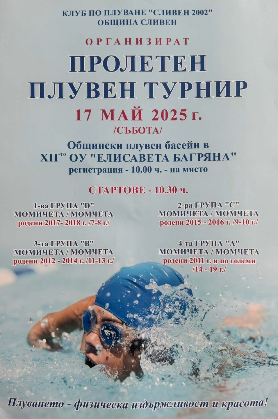 Пролетен плувен турнир ще се проведе тази събота, на 17 май в Сливен.