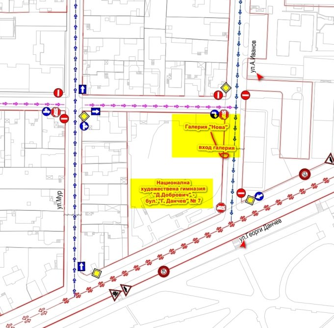 Входът за галерия „Нова“ е от улица „Антон Иванов“. За гражданите, които не знаят къде се намира галерия „Нова“, за улеснение прилагаме схема с указания в прикачен файл.