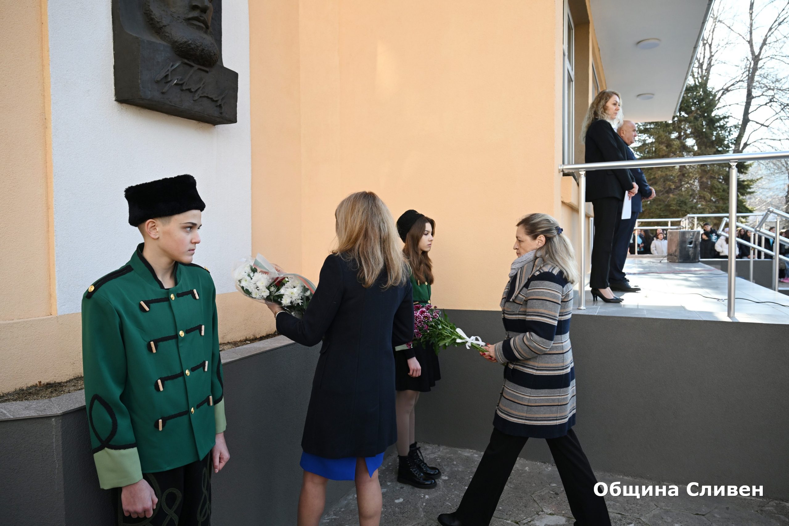 Венци и цветя пред барелефа на Ботев поднесоха заместник-кметът Пепа Чиликова, председателят на Постоянната комисия по образованието към Общинския съвет Лидия Димитрова, директорът на училището Денко Делчев, ученици и представители на народните читалища в Сливен „Христо Ботев 1897″ и „Хаджи Димитър 1937″, граждани.