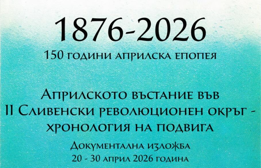 На 20 април в централното фоайе на Регионална библиотека „Сава Доброплодни“ ще бъде открита документалната изложба „Априлското въстание във II Сливенски революционен окръг – хронология на подвига“, посветена на 150 години от Априлско въстание.